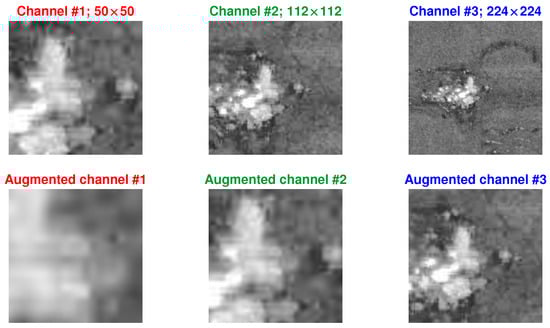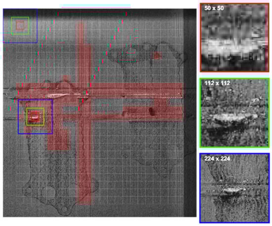In Dataset #2, three square image patches with side lengths of 50, 112, and 224 pixels were extracted from the same center point within the post-recoating image. These patches represent different spatial scales of the same region of interest and were resized to 224 × 224 pixels to match the input size of CNN architectures, such as VGG19. The patches were stacked along three channels (RGB), enabling the network to process localized details, intermediate structures, and global context simultaneously. This strategy enhances the model’s robustness to defect size variation and spatial dependencies.