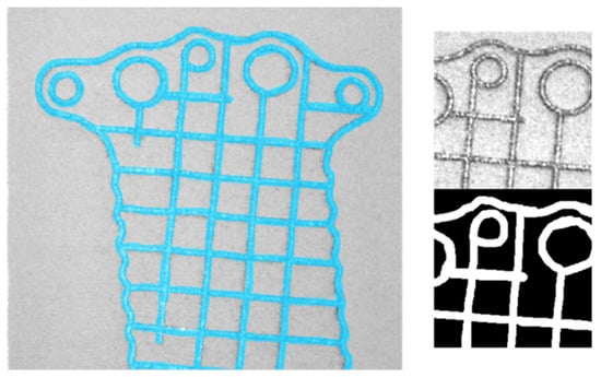 The labeling process for the dataset was carried out manually, with pixel-wise precision. Usually, the process of labeling starts with cropping small images and then assigning labels [11,22], but the concept presented here gives flexibility to automatically generate images with an arbitrary image square size. The transformation into square images is determined by two parameters: square size and threshold. Square size represents the number of pixels in both dimensions, while the threshold is defined as the ratio of labeled error pixels to the total area of the square. If this ratio exceeds the threshold value, the square image is labeled as “ERROR”. Otherwise, it is labeled as “OK”.