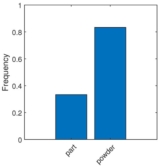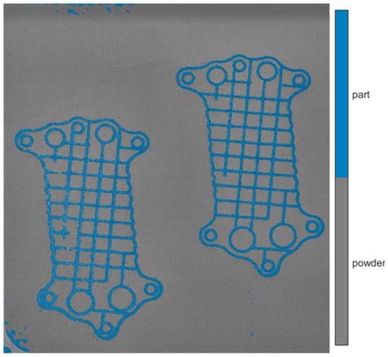 Figure 16 shows that the model demonstrates a good overall performance. In the context of this study, the Type I error (false positive—3.7%) is considered acceptable due to the conservative approach adopted. By prioritizing the detection of “Part” regions, even at the risk of occasional over-detection, the system ensures that critical areas are not missed. In Figure 17, an image of half of the layer is shown, where areas of powder are incorrectly classified as a part. Notably, the entire part was correctly classified, demonstrating the model’s ability to accurately identify the part regions despite some misclassifications in the powder areas.