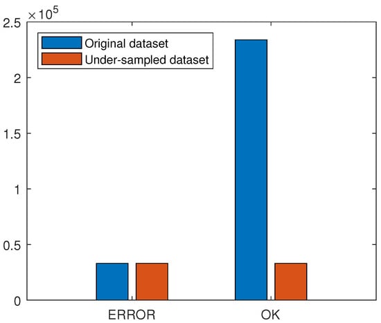 As depicted in Figure 5, the dataset is imbalanced. It may lead to misunderstanding the metrics used to describe model performance. Often, as a basic metric of performance, accuracy is used. In this case, a simple classifier that returns only the OK label would achieve an accuracy of 88%. This leads to the problem where the training process may favor the OK label over the ERROR label because the overall accuracy will be better, and the value of the loss function will be smaller. The solution for such a problem is to change the balance of the dataset and change the metric. To change the balance, over- and under-sampling can be used. Resampling techniques may be sophisticated, e.g., using the Nearest Neighbors approach, the Tomek Links method, or based on randomness [27]. Random Under-Sampling (RUS) is a resampling technique whereby samples of the majority class are randomly removed. The RUS technique may be used if there are a lot of samples. Since the OK label has over 230,000 samples, removing even 86% of them is acceptable (Figure 9). Removing such a significant part of the dataset for the OK label is also reasonable, as, for a vast majority of samples, the information is redundant—there are a lot of samples representing powder spread over the bed without any edges or blobs. Another advantage of under-sampling is that the dataset for training is much smaller, so the training is faster and easier to maintain. The disadvantage of the RUS technique is the risk that the majority class may be biased and not represent the overall label distribution. Another technique is over-sampling, which can be easily implemented by simply copying samples of minor classes. Over-sampling ensures that no information is lost, but it may lead to overfitting and create a significantly larger dataset. In the following case, it would create almost 0.5 million samples in the dataset, with most of them copied or having redundant information. This is the reason why over-sampling was not considered.