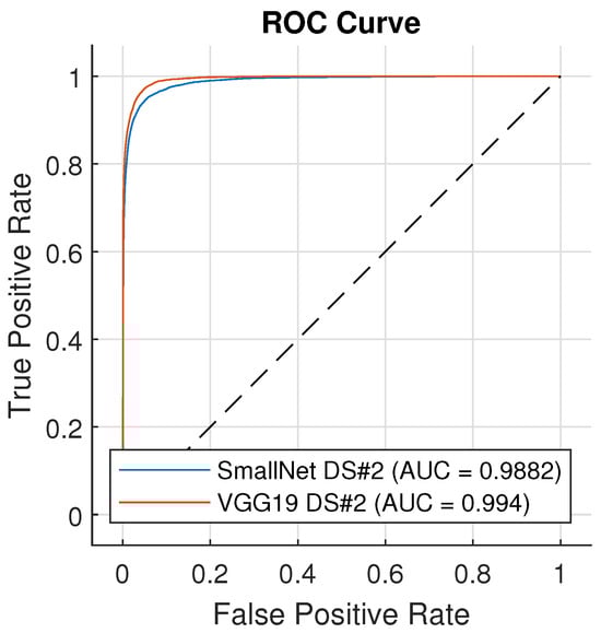 Table 2, Table 3 and Table 4 present the F1 score, MCC, and AUC results for the SmallNet and VGG19 models. Three different dataset configurations were examined (VGG19 was not evaluated for dataset #3 due to different input sizes). Based on the results, it can be concluded that the predictive capabilities of both models are very similar (with differences of 2.8% in F1 score, 2.95% in MCC, and 0.58% in AUC). The application of augmentation leads to a notable decrease in model accuracy. This may be attributed to the significant scale applied to resizing from 1 to 4, which introduces a substantial amount of noise into the dataset (see Figure 10). Augmentation techniques result in an average decrease in the F1 score metric by 10.3%, MCC by 11.4%, and AUC by 2.7%. The utilization of under-sampling (RUS) produces similar average decreases (F1 by 10.5%, MCC by 11.8%, and AUC by 0.9%). It may be caused by a too-high decrease in the number of samples used to train. The ROC curves for both models are shown in Figure 13, with the confusion matrixes in Figure 14. Model VGG-19 indicates better performance based on the ROC curve because it is closer to point (0, 1), and the true positive rate is greater for SmallNet for all thresholds. The confusion matrices indicate that VGG-19 significantly reduces Type I errors, resulting in a lower number of false positives, which means fewer false alarms are raised.