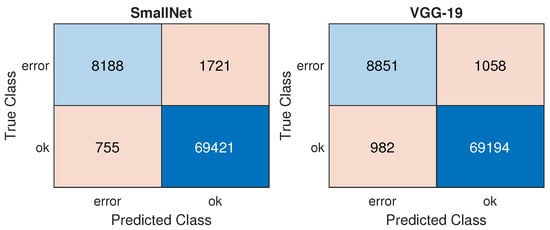 For the training of both models, the stochastic gradient descent with momentum (SGDM) optimizer was used, with momentum set to 0.8. The initial learn rate equals 0.001. The maximum number of epochs depends on the type of dataset used and the model but typically does not exceed 8. The other parameters of the training options were set to default according to documentation [28]. Based on the above, the training of the two CNN models (SmallNet and VGG-19) was performed for 3 datasets, with/without resampling and with/without augmentation, excluding the training of VGG-19 for dataset #3 due to a different input size, meaning transfer learning could not be adopted.