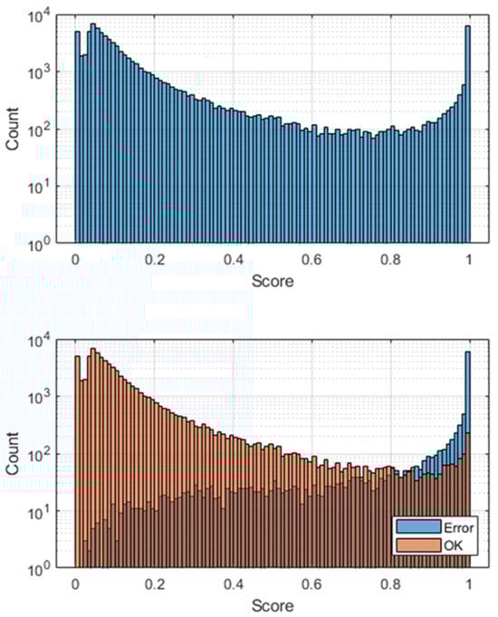 Figure 15 depicts two histograms for the entire population of the test set, one without specifying the ground truth (a) and the other with ground truth delineation (b). It is evident that with a threshold of 0.5, many labels that should be classified as OK (the orange color is ground truth) are wrongly categorized as ERROR because they have a value above 0.5. These instances represent false positives and contribute to Type I errors.