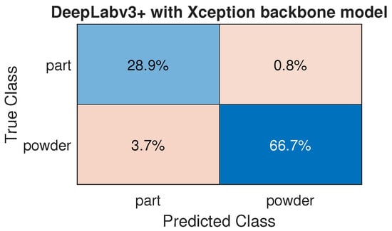 For the DeepLabv3+ model used for semantic segmentation, the CNNs listed in Table 5 were used as the backbone model. To evaluate performance, weighted intersection over unit (wIoU) for classes and normalized confusion matrices were utilized. wIoU is proposed because the classes (part and powder) are not balanced, so weights to balance them are assigned. Intersection over unit (IoU), also known as the Jaccard similarity coefficient, is calculated for a class as follows: