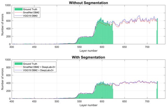 Table 6 presents a comparison of the analysis durations. The presented values were averaged based on all analyzed layers (724). The segmentation was carried out for every fifth layer, and the contribution of this activity is included in the averaged value (in the column with segmentation). The analysis process using the SmallNet model with segmentation is 4.51 times faster than the VGG19 model without segmentation.