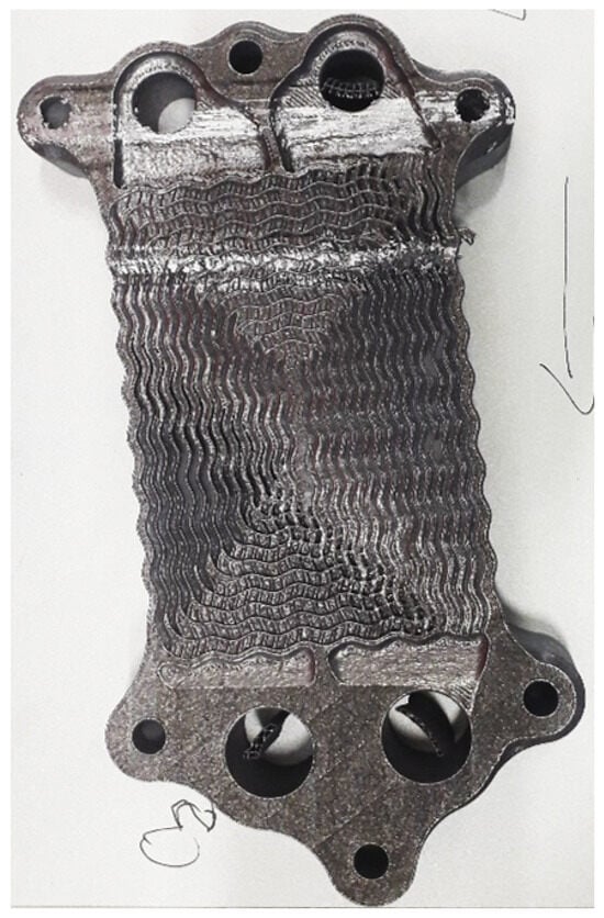 The classification process for each layer registered during the process is presented in Figure 19. The process was stopped at layer #724. The green bars indicate which layers were used for preparing the master dataset. Thus, the layers from 624 to 720 do not contain the ground truth. The process is shown, starting from layer #400, to provide a clearer view of the charts. The Y-axis represents the number of errors (squares labeled as errors). The classification process with segmentation shows the same characteristics, with the number of detected errors being lower compared to classification without segmentation, as some errors were detected outside the part’s area. This does not pose a problem when identifying layers where the number of errors increases. The increase in the number of errors (the derivative of the curve) is more significant than, for example, a constant number of errors, which could indicate false positives in detecting shaded areas. Despite SmallNet having lower overall performance, both curves similarly indicate that the process is corrupted. The ground truth value for the monitoring system with segmentation was calculated due to the number of errors for the ground truth accumulating in only the pre-filtered areas. Figure 20 shows one of the heat exchangers after layer #724. The process was manually stopped due to a heat exchange core being significantly damaged.