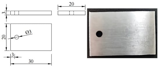Q345 low-alloy high-strength steel (composition: C 0.18%, Mn 1.50%, Si 0.55%, P ≤ 0.025%, S ≤ 0.020%, Fe balance) was machined into rectangular plates (30 mm × 20 mm × 3 mm). Prior to testing, all specimens were sequentially polished with 400–2000 grit SiC abrasive paper to achieve a mirror finish (Ra ≤ 0.1 μm), degreased ultrasonically in acetone for 15 min, and dried under nitrogen flow. The specimen image is depicted in Figure 1.