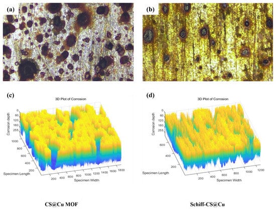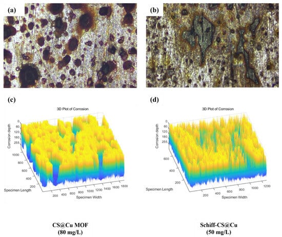 From Figure 4a,c, it can be seen that the black corrosion spots on the surface of the steel samples at a CS@Cu MOF concentration of 80 mg/L were denser and larger in area, and accompanied by deeper corrosion pits. However, Figure 4b,d confirms that the number and area of black spots on the sample surface at Schiff–CS@Cu concentration of 50 mg/L were smaller, and the depth of corrosion was shallower (except for a few lumpy and shallow corrosion pits) compared to CS@Cu MOF. This phenomenon indicated that the corrosion inhibition effect of Schiff–CS@Cu on the steel was superior to that of CS@Cu MOF in the respective most unfavorable corrosion inhibition effect, which was consistent with the conclusion of Section 3.1.