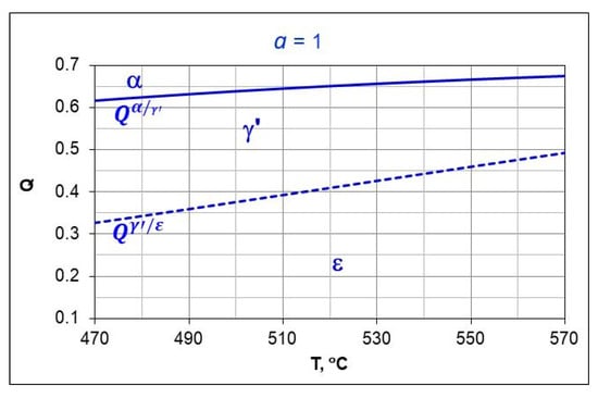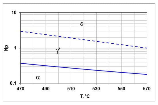 By substituting the relationships (8) and (9) into Equation (14), we obtain functions for calculating the temperature-dependent hydrogen content limits γ’ and , which correspond to the nitrogen limit potentials and of the Lehrer system.