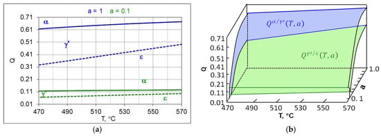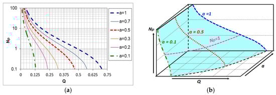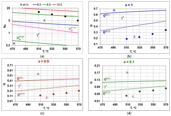 As can be seen in Figure 5, unlike the single-component ammonia ingoing atmosphere, different ammonia contents in the two-component ingoing atmosphere can correspond to a single potential value (Np = 1) and different hydrogen contents in the outgoing atmosphere (line Np = 1, Figure 5a). At the same time, one value of hydrogen (Q = 0.25) can correspond to different values of the nitrogen potential (line Q = 0.25, Figure 5a). By solving Equation (11) against Q, we obtain the dependence of the hydrogen content of the nitriding atmosphere on the nitrogen potential and the ammonia content (a) in the ingoing atmosphere aNH3/bN2. The general form of the function is the same as for the single-component ammonia ingoing atmosphere, with the difference that the values of the coefficients u, v, and w of the equation are a function of the ammonia content (a) in the ingoing atmosphere: