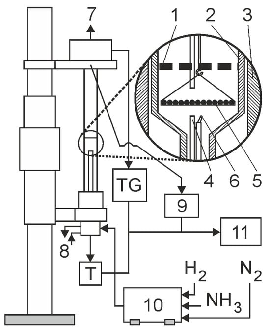 General diagram of the functioning of a thermobalance, 1—shutter; 2—reactor wall; 3—reactor furnace; 4—gas phase sampling point; 5—sample holder with single layer of grains; 6—thermocopule; 7—vent; 8—cooling water (closed circuit); 9—hydrogen analyzer; 10—gas mixer; 11—process control computer.