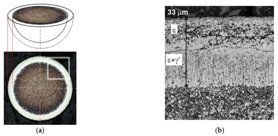 Metallographic tests were performed on the specimens hot-encapsulated in thermosetting resin. The encapsulated balls were ground to their diameter, which made it possible to observe an iron nitride layer of actual thickness. Figure 9a shows the method of measuring the thickness of the iron nitride layer, and Figure 9b shows the appearance of the sphere before and after encapsulation and grinding.