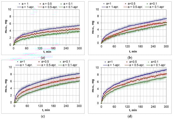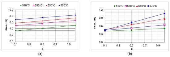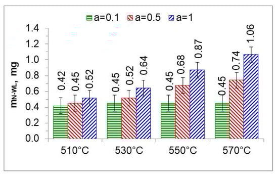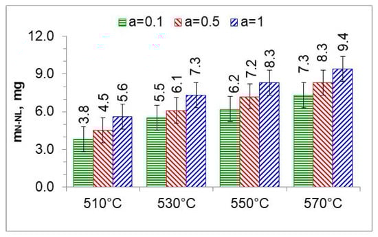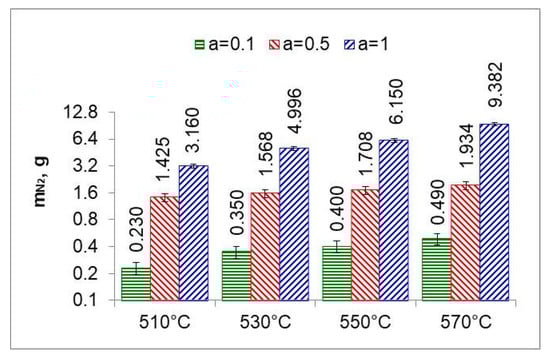 Figure 10 shows the weight change in the AISI 52100 steel samples during nitriding in the temperature range 510–570 °C in nitriding atmospheres with different ammonia contents in the ingoing atmosphere. The lowest weight gains of the samples occurred at 510 °C and using the ingoing atmosphere of 10%NH3/90%N2 (Figure 10a, a = 0.1), with the highest at 570 °C when using the ammonia atmosphere (Figure 10d, a = 1).