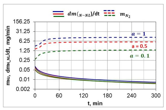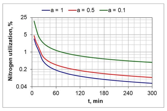 By substituting the relationship (5) into Equation (25), we obtain a formula that allows us to calculate the availability of nitrogen as a function of time and the hydrogen content of the outgoing atmosphere: