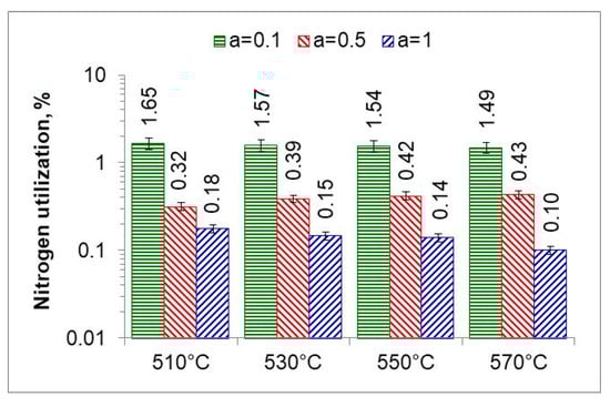 The calculations show that in the case of a nitrogen-diluted ingoing atmosphere, the largest error in estimating the value of nitrogen potential can occur when using the 10%NH3/90%N2 atmosphere—its value increases as the temperature decreases from 30% to 40% at 570 and 510 °C, respectively (Figure 8, a = 0.1).