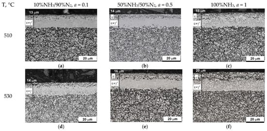Reducing the ammonia content of the ingoing atmosphere (aNH3 = 0.1) had the effect of reducing the nitrogen content of the near-surface layer to ≤8.5% by weight, which promoted the formation of layers with γ′ + α or γ′ + ε mixture structures. These layers were characterized by lower hardness and a limited thickness of the solution zone.