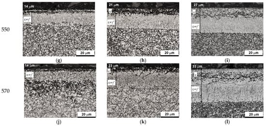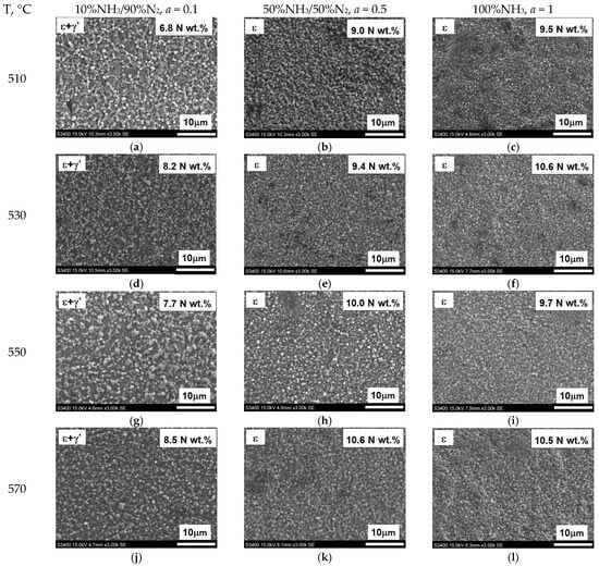 Figure 21 shows the surface appearance of AISI 52100 steel specimens nitrided at 510, 530, 550, and 570 °C in the nitriding atmospheres obtained from the ingoing atmosphere of 100%NH3 (a = 1), 50%NH3/50%N2 (a = 0.5), and 10%NH3/90%N2 (a = 0.1), the images show the average values of nitrogen concentration in the near-surface zone of the iron nitride layer. At steady-state temperature, in all processes, the potentials took on values from the phase persistence area ε. The concentration of nitrogen in the near-surface zone of iron nitrides formed by the 10%NH3/90%N2 atmosphere does not exceed 8.5% by weight (Figure 21a,d,g,j). The nitride layers formed under these conditions are a mixture of the ε and γ’ phases. In contrast, in the other samples (Figure 21b,c,e,f,h,i,k,l), the concentration in the near-surface zone of the nitrides exceeds 8.5% by weight; in this case, the iron nitride layers are two-zoned, where the zone near the surface is formed by the ε phase and below it—by the ε + γ zone.