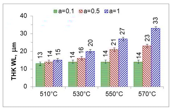 The solution zone of the nitrided layer was characterized by the maximum hardness (the highest hardness on the hardness distribution) (Figure 23a) and the effective thickness of the solution zone—core hardness plus 50 HV () (Figure 23b). The maximum hardness and effective thickness of the nitrided layers depend equally on the temperature and on the degree of nitrogen dilution of the ammonia atmosphere. Maximum hardness and effective thickness rise with rising temperature and rising ammonia content in the ingoing atmosphere aNH3/bN2 maximum values were obtained for the ammonia ingoing atmosphere of 100%NH3 (a = 1).