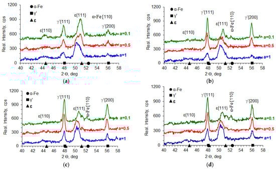 All analyzed samples show the presence of γ′-phase iron nitrides (Fe4N) and ε-phase iron nitrides (Fe2–3N), as confirmed by characteristic diffraction lines at 2θ = 40–58°.