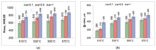 Maximum hardness (Hmax) (a) and effective thickness gc50HV of the nitrided layer (b).