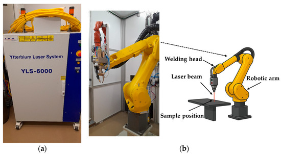 Experimental setup of the laser welding system: (a) laser source (IPG YLS-6000: Ytterbium Laser), (b) laser welding head and components.