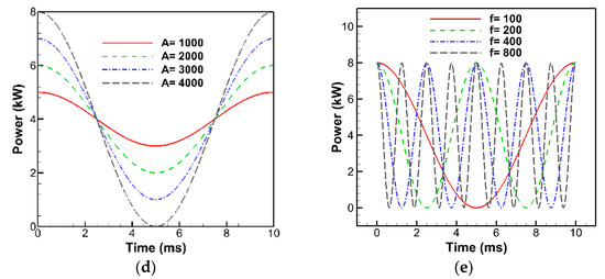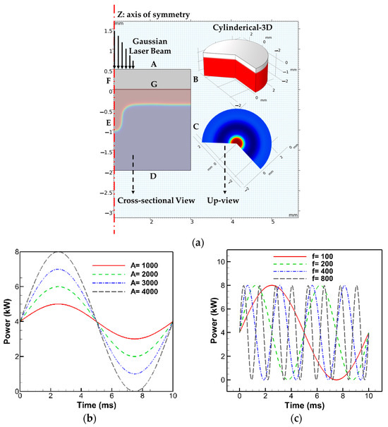 Laser spot welding was simulated using a 2D axisymmetric model in COMSOL Multiphysics 5.6, justified by the rotational symmetry of the stationary laser beam around the vertical z-axis. This setup allowed for efficient representation of 3D behavior via symmetry. This study investigated the pulse modulation impact by applying sinusoidal and cosinusoidal laser power distributions, focusing on keyhole stability and overall welding efficiency. The study applied sinusoidal and cosinusoidal laser power profiles to examine their impact on keyhole stability and welding efficiency. The computational domain and power profiles are shown in Figure 2. Boundaries ABGF and EGCD represent air and aluminum, respectively. A Gaussian beam was used to model the laser heat source.