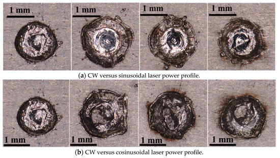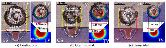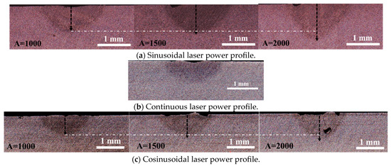 Figure 4 presents top-view images of the laser spots under different power profiles. The weld width increased with both sinusoidal and cosinusoidal profiles and further widened with higher power amplitudes compared to the continuous mode. These results confirm the superiority of modulated profiles in achieving greater depth-to-width ratios using the same total laser energy.