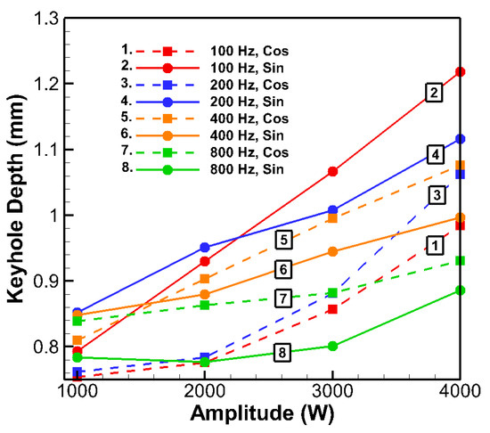 Keyhole depth versus amplitude at different frequencies for sinusoidal and cosinusoidal laser profiles.