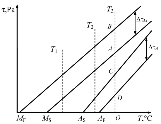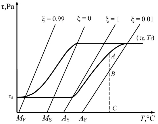 It should be noted that the lines indicating the start of the phase transformation correspond to the equality condition in Equation (5). The region between the start and finish lines of the transformation can be referred to as the phase transformation band. The transformation completion lines intersect the abscissa axis at the points MF and AF, which can be determined from the second equations of systems (13) and (16) by setting τ = 0: