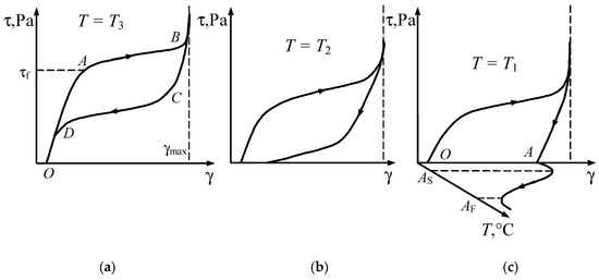 The deformation process of the specimen at a constant temperature is described by curves obtained by intersecting surfaces f (τ,γ,T) = 0 with a plane T = const, parallel to plane τ–γ. According to Equation (20), during loading, martensitic transformation occurs, the phenomenology of which is described by the second equation in system (4), whereas during unloading, the reverse martensitic transformation takes place, described by the third equation in system (4).