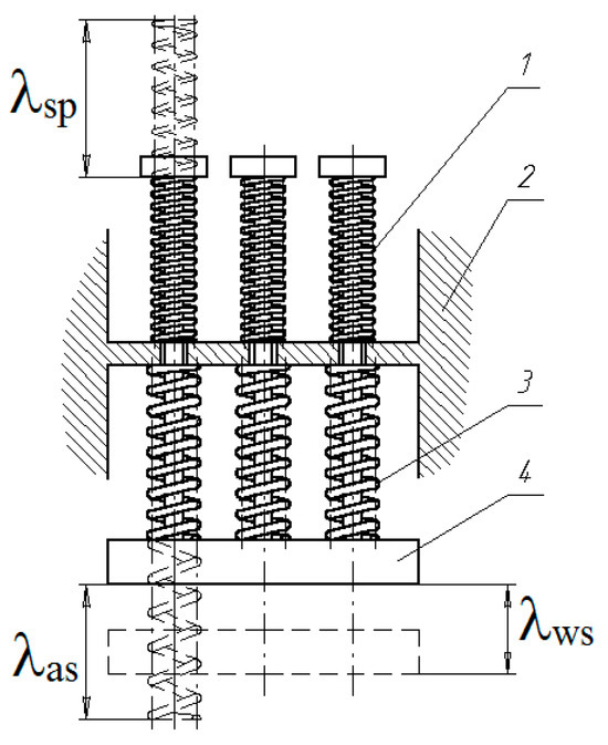 The studied springs made of a shape memory alloy were used as thermosensitive elements (TSE) in the actuator of a temperature control regulator [15,16]. An actuator mechanism of the regulator was manufactured, consisting of “i” TSEs and “j” return springs, with the schematic diagram shown in Figure 6. A significant influence on the functionality of such an actuator is exerted by the constant nature of interaction between the counterbody and the force element. The movable link 4 of the device, connected to the working body, automatically responds to temperature changes in the controlled medium, moving by the value of the working stroke λws under the action of spring elements 3 with SME and return springs 1, relative to the stationary housing 2. The assembly deformation of the SME springs is equal to λas, and that of the return springs is λsp.