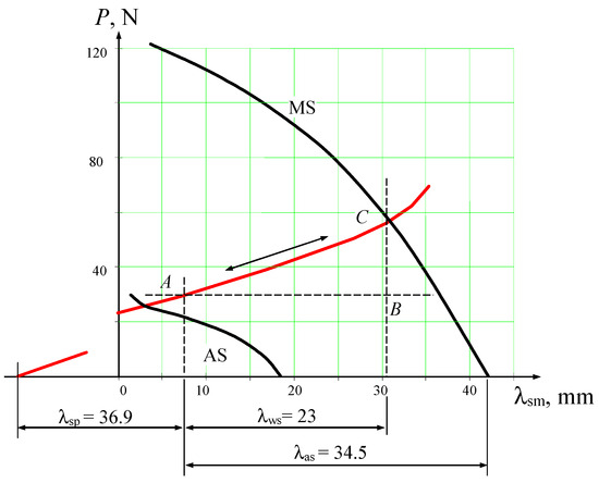 The deformation–force diagram, which defines the relationship between the forces generated by the thermoactuator and the displacements of its output link, is shown in Figure 7. It was obtained by projecting the surfaces f (P,λ,T), which describe the relationship among force (P), deformation (λ), and temperature (T) parameters of the TSEs during forward and reverse martensitic transformations, and the plane representing the behaviour of the return springs onto a plane perpendicular to the temperature axis T.