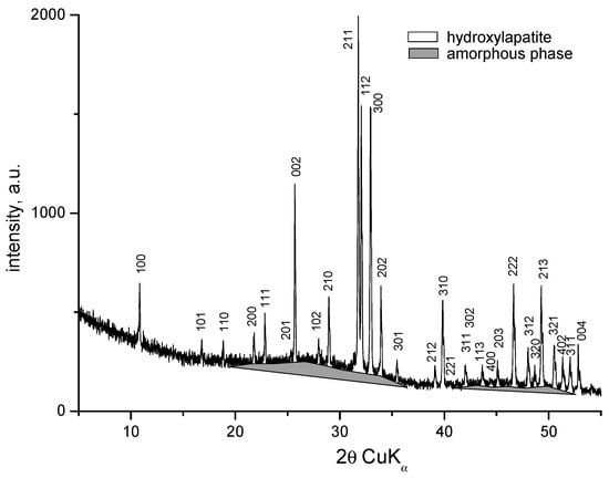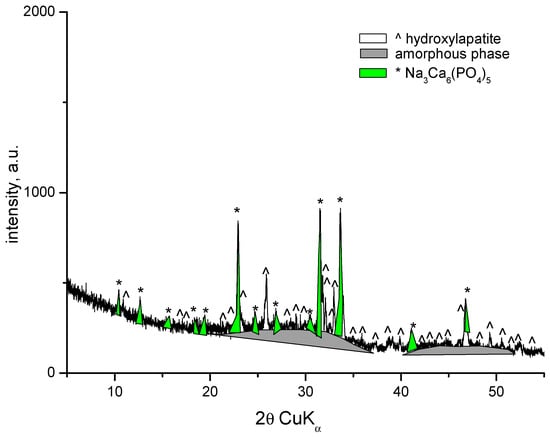 XRD patterns of the samples with compositions 1 and 2 are identical and show amorphous halo and diffraction peaks. The XRD pattern of the sample with composition 2 is presented in Figure 3. Along with the amorphous phase, the main crystalline phase in both compositions is hydroxyapatite (PDF # 01-073-1731). The amorphous phase is more abundant in Sample 2. The X-ray diffractogram of the sample with composition 3 shows the presence of an amorphous phase, a small amount of hydroxyapatite (PDF # 01-073-1731), and the formation of a new fine crystalline phase of sodium calcium phosphate Na3Ca6(PO4)5 (PDF # 11-0236) (Figure 4). In this case, dissolution of hydroxyapatite in the amorphous phase and crystallization of sodium calcium phosphate probably occurs. H. Demirkiran et al. also identified the formation of the Na3Ca6(PO4)5 phase in hydroxyapatite–bioglass composites [20]. In compositions containing higher bioglass content (10 and 25 wt%), additional crystalline phases-namely calcium phosphate silicate (Ca5(PO4)2SiO4) and sodium calcium phosphate (Na3Ca6(PO4)5), were observed, embedded within the amorphous silicate matrices.