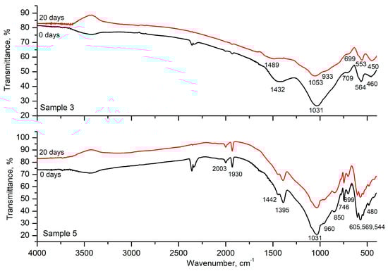 The results of the FTIR spectra of Samples 3 and 5 before and after 20 days in SBF are shown in Figure 7. The spectrum of Sample 3 after 20 days shows small changes. The bands at 1432 cm−1 and 1031 cm−1 are shifted to higher frequencies; a shoulder at 933 cm−1 appeared, and the bands at 709 cm−1, 564 cm−1, and 460 cm−1 are shifted to lower frequencies. No changes in the spectra are observed in the spectra of Sample 5 after 20 days in the SBF.