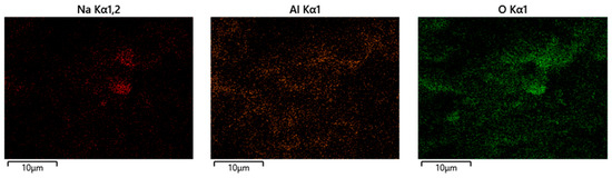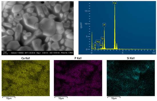 SEM and EDS analyses of the glass–ceramic materials with biogenic hydroxyapatite confirm the results of XRD and FTIR analyses. The results from SEM and EDS analyses of glass–ceramic samples with composition 3 are presented in Figure 8. Uniformly distributed hydroxyapatite and Na3Ca6(PO4)5 are observed in the amorphous matrix. SEM and EDS of ceramic samples with composition 5 are presented in Figure 9. The SEM image of the sample with composition 5 shows hexagonal crystals of hydroxyapatite with a size of 10 µm, sintered with the aid of the glass additive.