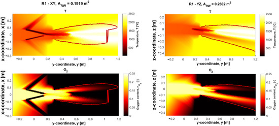 The temperature and gas composition fields for CFD simulation of the reference case R1 are presented in Figure 3 for the XY (the horizontal plane through the lances, as seen from above) and YZ (the vertical plane through the center of the tuyere, as seen from the side) planes, respectively. The temperature and gas compositions for R2–R4 are illustrated in Figure A1, Figure A2 and Figure A3 (Appendix A). The raceway boundaries are represented by the red lines and ARW denotes the area of the bounded raceway region.