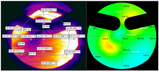 The measurement software PYROSOFT Professional (version 4.2.2.2) was used to define regions of interest (ROI) which can be points, lines, rectangles, circles/ellipsis, polygons, or free drawing. From ROI it is possible to define values of interest (VOI) which have been used in these measurements. For all VOI’s it is possible to have different information, for example, maximum, minimum, average, cross section temperatures, etc. With the software, it is possible to monitor and save temperature measurements. The sequence and formatting of file saving can be decided, such as sampling time, processing of temperature readings etc.