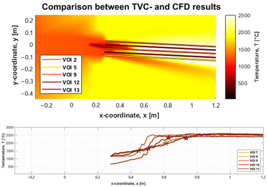 A comparison between the temperature data, VOI, of the TVC to the CFD model is shown in Table 6, whereas the CFD results are extracted from the simulations on a plane 0.35 m from the tip of the lance. From the overall trends, the TVC measurements indicated higher temperatures for most measurements. The exceptions are VOI 2, which lies on the top edge of the tuyere, as well as VOI 8, 12, and 13, which all lie in the region affected by the plume. This indicates that the TVC is restricted from measuring deeper into the center of the raceway when there is a coal plume present. The resulting temperature from the points in the plume may however still be useful to determine the temperature at the plume in the raceway.