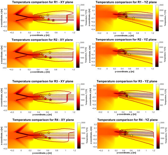 CFD temperature lines from the XY- and YZ-planes compared with average temperature at the TVC measurement points, the stars indicate where the CFD model temperature matches the measured TVC average temperature. From top to bottom R1, R2, R3 and R4.