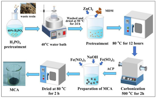 The WAR underwent sequential pretreatment steps. First, it was washed three times with deionized water and dried at 50 °C for 24 h. For chemical activation, 5 g of the WAR was mixed with 50 mL of 40% H3PO4 in a 100 mL beaker and stirred at 500 rpm in a 40 °C water bath for 4 h. The H3PO4-treated resin was then washed with deionized water, dried at 50 °C for 24 h, subsequently impregnated with ZnCl2 at a 1:1 mass ratio, and then cured in an oven at 80 °C for 12 h, from which we obtained the modified material (MDM). Adding ZnCl2 during the carbonization process can effectively increase the specific surface area, and also increase the presence of oxygen-containing functional groups (such as carboxyl groups and phenolic hydroxyl groups), thereby enhancing the adsorption capacity of the MCA for Cr(VI). Subsequently, the MDM was treated by pyrolysis and carbonization.