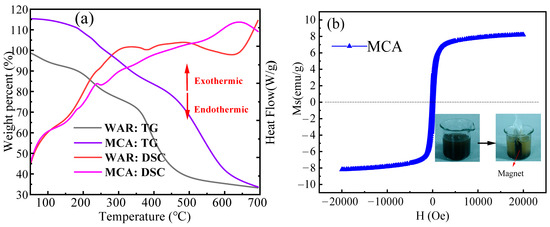 (a) Thermogravimetric diagrams of three adsorbents and DSC analysis of three adsorbents; (b) Magnetic hysteresis loop of the MCA.