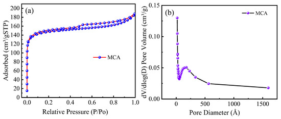 Figure 4a shows the N2 sorption-desorption isotherms and hysteresis loop curves of the MCA at relative pressures. It can be seen that the MCA conforms to the type II isotherm model and the H4 hysteresis loop model, respectively. This indicates that these two adsorbents have a non-porous structure, and the adsorption phenomenon occurs due to the interactions between the surface of the adsorbent and the adsorbate. It can be seen from Figure 4b that the distribution of the pore structure of the MCA is more concentrated, and the pore size of the MCA is mainly concentrated around 20 nm. The specific surface area and pore size are shown in Table 4. The specific surface area of the MCA is 569.89 m2/g, indicating that the MCA has a large specific surface area, with an average pore size of 20.38 nm.