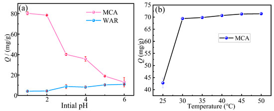 (a) Effect of initial pH on adsorption capacity, (b) effect of temperature on adsorption capacity.