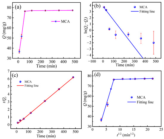 Adsorption kinetics is an important aspect in the evaluation of the adsorption performance of the MCA; therefore, the reaction kinetics at different temperatures were investigated (Figure 6a–d). As shown in Figure 6a, within the first 30 min there was a significant increase in adsorption capacity due to the accessible adsorption sites on the resin surfaces and the high concentration of Cr(VI). The MCA reached adsorption equilibrium after 1 h, achieving maximum Cr(VI) removal efficiency.