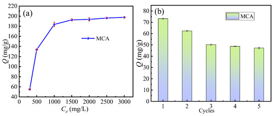 (a) Effect of initial concentration on adsorption capacity of the MCA; (b) Reuse performance.