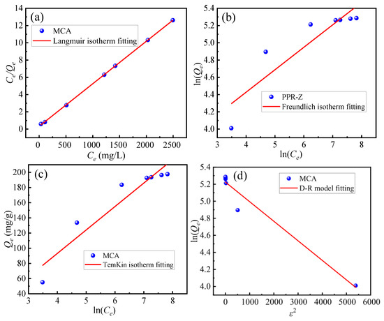 (a) Langmuir adsorption isotherm fitting, (b) Freundlich adsorption isotherm fitting, (c) TemKin adsorption isotherm fitting, (d) D-R model fitting.