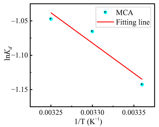 The thermodynamics of the adsorption process is a key factor affecting the adsorption process and is also an important reference for understanding the spontaneity and energy changes of the adsorption process of adsorbents. Equations (11) and (12) were used to investigate the spontaneity and free energy changes of the adsorption behavior of the MCA during the adsorption of chromium ions in the presence of adsorption saturation, as shown in Figure 9.