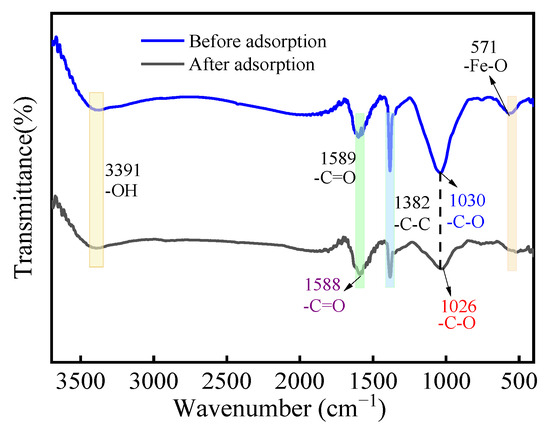 The FTIR spectra of the MCA before and after adsorption is shown in Figure 10. Before the adsorption, the absorption peaks for -OH, -C=O, -C-C, -C-O, and -Fe-O appeared at the positions of 3391 cm−1, 1589 cm−1, 1382 cm−1, 1030 cm−1, and 562 cm−1, respectively. Comparing the absorption peaks curves after the adsorption and desorption, after the adsorption, the absorption peaks of -Fe-O in the MCA were shifted from 562 cm−1 to 520 cm−1, indicating that -Fe-O interacted with the Cr(VI) during the adsorption process, resulting in the shift of the absorption peak. In summary, the FTIR analysis illustrated that the -Fe-O functional group played an important role in the adsorption process. FTIR spectroscopy confirmed the dominant role of -C=O, C-O, and Fe-O in the adsorption process.