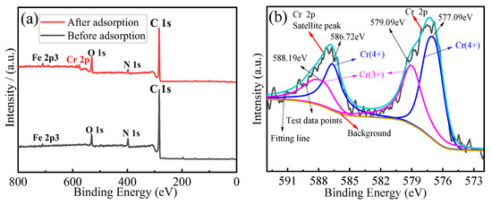 Figure 11a presents the XPS survey spectra of the MCA before and after Cr(VI) adsorption. Characteristic peaks corresponding to C 1s, N 1s, O 1s, Cr 2p and Fe 2p3 were observed at binding energies of 284 eV, 400 eV, 530 eV, 577 eV and 710 eV, respectively. After adsorption, a distinct Cr 2p peak appeared at 577 eV, confirming the successful adsorption of the Cr(VI) onto the MCA.