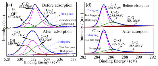 Figure 11c shows a significant shift in the binding energy of the carbonyl (-C=O) oxygen peak from 533.56 eV to 532.79 eV after Cr(VI) adsorption. In contrast, the O 1s peak associated with carboxyl/carbonyl carbon (-C-O/-C=O) in the high-resolution C 1s spectra (Figure 11d) exhibited a much smaller shift, changing only from 288.76 eV to 288.85 eV. The pronounced shift in the oxygen peak strongly suggests that the carbonyl oxygen atoms (-C=O) directly participate in chelation with Cr(VI) ions in solution. This interaction stabilizes the adsorbed complex, leading to a decreased binding energy (indicating a lower energy state) and the formation of a stable structure. FTIR and XPS spectroscopy confirmed the dominant role of -C=O and C-O in the adsorption process.